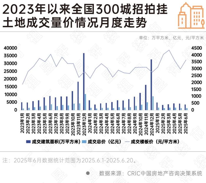 2025年上半年,土地市场延续“缩量提质”趋势,CRIC数据显示,上半年,全国300城经营性土地成交建筑面积2.5亿平方米,较2024年同期下跌8%,再度刷新2010年以来的上半年新低纪录。各月份成交规模均保持同比回落。