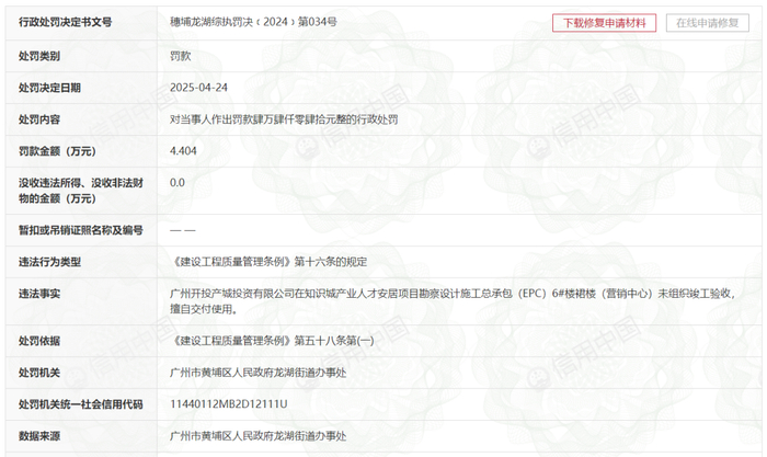 另外,需要注意的是,信用中国显示,今年4月,广州开投产城因在知识城产业人才安居项目勘察设计施工总承包6#楼裙楼(营销中心)未组织竣工验收,就擅自交付使用,而被广州市黄埔区人民政府龙湖街道办事处罚款4.404万元。