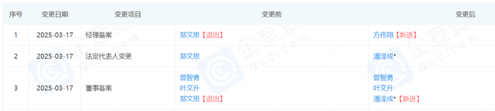 今年3月,该公司高管发生变更,原董事长、经理郑文思退出,由潘泽成接任董事长一职,方伟翔接任经理。