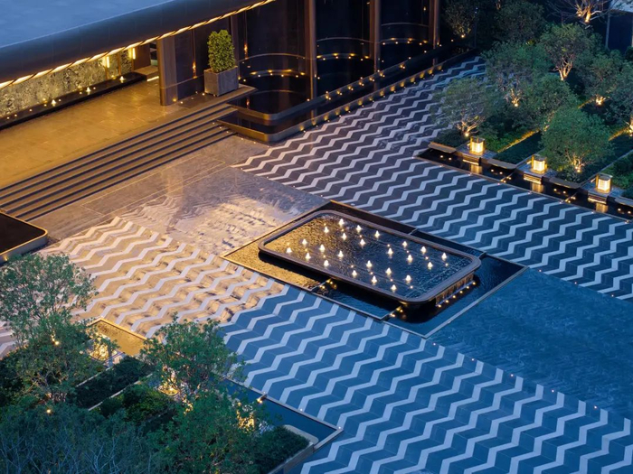 前广场上的镜面水景居中,树阵与灯具分列两旁,天然带有厚重的归家礼序,双色拼接的波纹地砖,象征千年商都的出海精神。