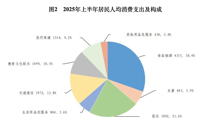 上半年,全国居民人均食品烟酒消费支出4355元,增长3.3%,占人均消费支出的比重为30.4%;