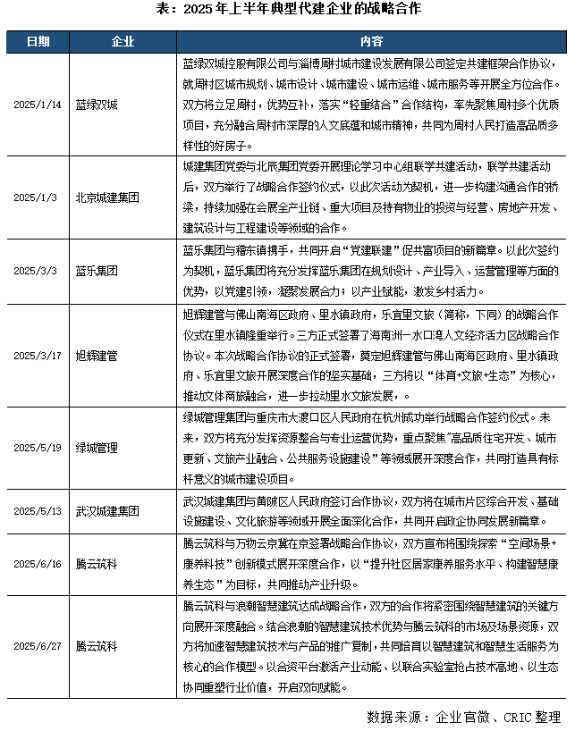 2025年上半年,多家代建企业通过战略签约方式深化业务布局,总体呈现出多元化的合作格局。实际上,自2024年开始,“合纵连横”就成为企业发展战略中的重要一环,尤其是在代建行业由“蓝海”转向“红海”、竞争加剧之下,企业持续通过资源整合、签署战略合作协议等方式提前锁定潜在委托方,在降低成本的同时提升竞争力。