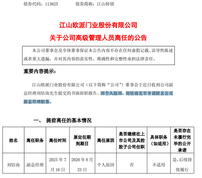 乐居财经 李兰 7月17日,江山欧派(603208.SH)发布公告,因个人原因,刘佶南申请辞去公司副总经理职务。这是继7月9日公司董事、副董事长、总经理王忠辞职后,江山欧派短期内发生的又一高层人事变动。