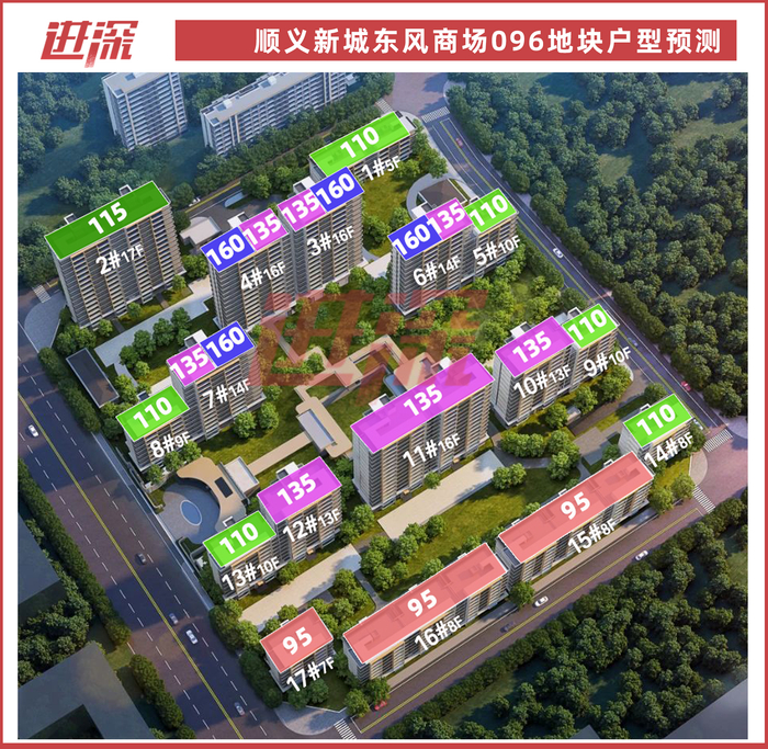 洋房预计为95/110/115㎡小户型,中间的小高层房源则是建面135/160㎡两种改善产品。