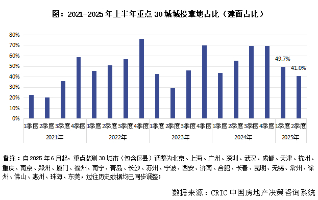 根据CRIC监测的重点30城数据显示,2025年上半年城投及平台公司参与拿地的建面超过2200万平方米,较2024年上半年微增4%,占比为45%,较2024年上半年、2024年全年分别下降5个百分点和19个百分点。
