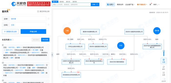 查关系信息显示,田朴珺与王石无直接商业关联。