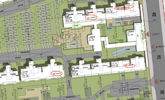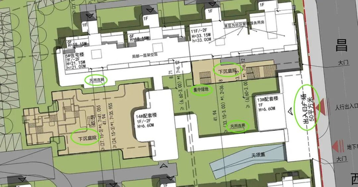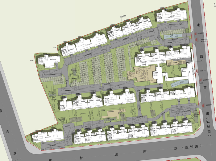 大门位于小区东侧,做了50平米出入口广场,向内由风雨连廊串联两栋配套楼。