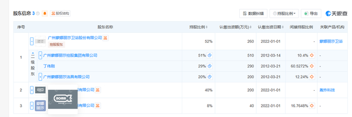该公司由广州蒙娜丽莎卫浴股份有限公司、广州奥库智能家居有限公司、广州蒙娜丽莎洁具有限公司共同持股。其实控人为丁伟刚,拥有六成表决权。