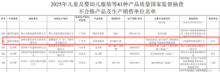 乐居财经 李兰 近日,国家市场监督管理总局发布2025年儿童及婴幼儿服装等41种产品质量国家监督抽查情况通报。其中,抽查发现34批次陶瓷坐便器产品不合格。