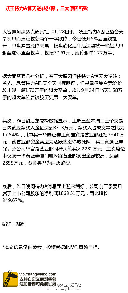 大智慧阿思达克通讯社10月28日讯,妖王特力A因证监会天量罚单而连续收获两个一字跌停,今日低开5%后直线拉升,早盘冲击涨停未果,横盘消化后午后逆势被一笔超大单封至涨停直至收盘,收报77.61元,涨停封单1.22万手。