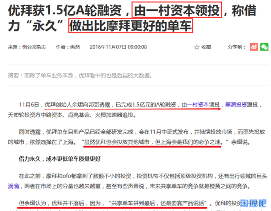 11月6日,优拜创始人余熠向笔者透露,已完成1.5亿元的A轮融资, 由一村资本领投,黑洞投资跟投,天使轮投资方中路资本、点亮基金、火橙加速器追投。同时透露,优拜单车目前产品已经全部研发完成,会在11月中正式发布, 并陆续投放市场,而率先投放的城市,依然选择在了上海。“虽然优拜也会投放其他城市,但上海会是我们的必争之地。”余熠说。