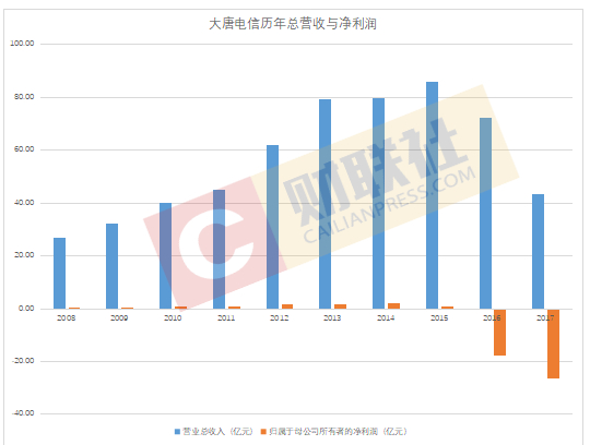 不只是2018年第一季度;近年来,大唐电信正陷入亏损的泥潭。2017年,公司净利润为亏损26.49亿,2016年亏损17.76亿。事实上,自其1998年上市以来,大唐电信合计净利润为亏损49.55亿。