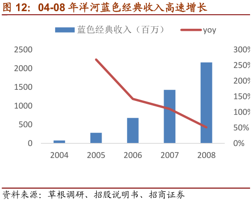 蓝色经典快速放量,成为主要增长极,海之蓝为主力。洋河的主打产品洋河蓝色经典,自2003年推出以来,以精准定位快速放量,销售规模迅速扩大。2004年,洋河蓝色经典全年销售7600万元;2005年销售达2.8亿元,同比增长269%;2006年达6.78亿元,同比增长140%,每个月的销售增长幅度都在三位数以上;2007年,蓝色经典厚积薄发,单个品牌销售全年完成14.27亿元;2008年,蓝色经典延续了更强劲的发展势头,全年销售达到21.6亿元,成为中高档酒成长的典范。2004-2008年公司中高档酒收入复合增长率达82.16%,毛利率亦持续提高。在此期间,海之蓝为增长主力,在蓝色经典系列中占比最高。