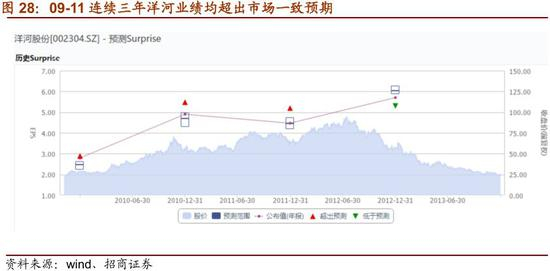 当时洋河的价值仍被低估,核心原因是业绩持续超预期。09-11年洋河实际EPS分别为2.79、4.90、4.47,而当时市场一致预测分别为2.47、4.70、4.46,连续三年洋河的业绩均超出市场预期。而业绩持续超预期的原因是,产品放量、提价与结构升级三方面共振,使得营收增长、毛利提升幅度超出市场预测。当时我们已经意识到洋河核心产品快速放量,给出洋河10年EPS预测值为4.79,11年EPS预测值为4.40,实际从后来的公司业绩来看,洋河10和11年的EPS分别达到4.90和4.47元,是超出我们预期的。