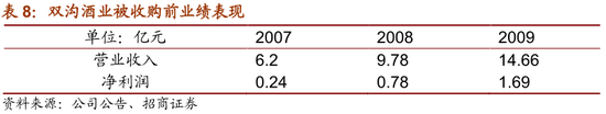 双沟酒业位于江苏省宿迁市,规模上在江苏省内仅次于洋河。双沟酒业拥有3700多名职工,年生产能力4万吨,拥有“苏酒”、“珍宝坊”、“青花瓷”、“柔和”四大系列200多个品种,其中“苏酒”和“珍宝坊”在江苏省内知名度很高,民间历来有“喝苏酒,抽苏烟”的说法。双沟酒业销售主要来自省内,主要销售区域在徐州、宿迁、淮安、无锡等地。收购前07-09年双沟酒业营收和净利润逐年提升,业绩表现良好。