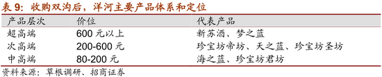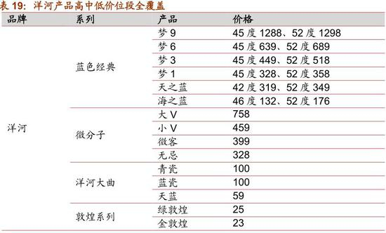 公司自2003年起推出蓝色经典系列后,海之蓝、天之蓝、梦之蓝与洋河大曲、敦煌古酿、洋河普优曲一起,形成了高、中、低档全价位覆盖的产品线。2010年收购双沟酒业后,双沟珍宝坊系列、苏酒系列、柔和系列中高低全档位覆盖,蓝色经典系列和珍宝坊系列形成了良好的互补,产品线分布更加细化和完整。近年来,为了迎合大众消费需求的升级,公司还推出了主打健康的微分子酒及蓝色经典系列的升级版——5A蓝色经典(A 级原料、A 级基酒、A 级工艺、A 级窖池、A 级窖藏)。