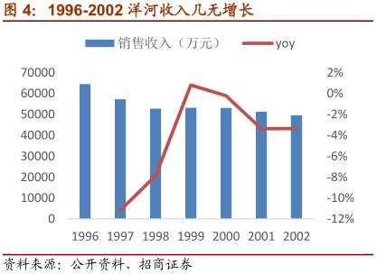 第一阶段:业绩下滑、陷入低谷(1996-2002)。90年代末至02年,由于公司内部丧失了竞争意识和竞争能力,叠加外部市场环境发生了极大变化,洋河一度陷入低谷。学习五粮液买断开发模式,但收效甚微。
