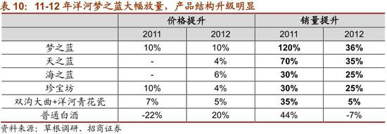 结构持续升级,高端产品占比不断提升。09-12年,随着4万亿投资启动,固定资产投资和房地产市场再次注入强心剂,各个地方政府相继推出投资计划,地产投资和房价快速回升,地产酒迎来高速增长期,洋河中高端产品快速放量,同时叠加提价,中高档白酒营收占比从2009年85%提升至2012年92%,其中梦之蓝、天之蓝在09、10、11年增速均在100%以上。除了蓝色经典,珍宝坊也增速很快,11年帝坊增500%以上,圣坊增300%以上,君坊也保持较快增长。产品结构的提档升级在增加经济效益的同时,也大大提升了洋河的品牌形象。