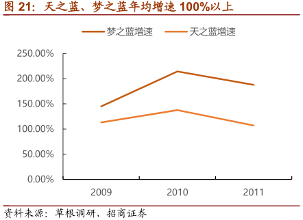 2003年9月,洋河创新性推出蓝色经典系列产品。“洋河蓝色经典”有三种:海之蓝(118元)、天之蓝(200-300元)、梦之蓝(400元以上),档次与价格从低到高。洋河蓝色经典目标群体主要是政府机关、企事业单位以及成功人士招待用酒,同时兼顾高档礼品酒市场。并以“世界上最宽广的是大海,比大海更高远的是天空,比天空更博大的是男人的情怀”作为宣传标语。洋河蓝色经典自推出后快速增长,我们认为蓝色经典取得成功主要有以下几点原因: