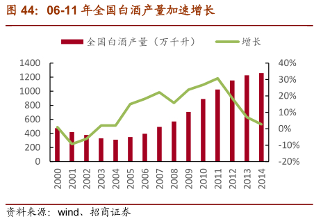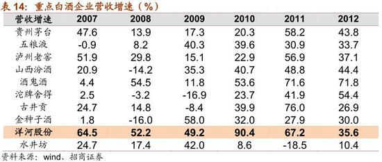 从洋河的例子跳出看白酒企业,一个公司的发展离不开行业的大背景。洋河07-12年的快速发展与当时白酒行业快速扩容、百花齐放的行业背景密不可分。但与此同时,企业的内功也非常重要,洋河自身的不懈努力、一流的内功对公司的快速发展发挥了极其重要的作用,并且在13-14年行业调整期帮助洋河平稳度过。09-12年,洋河的快速发展受益于内外双重因素:(1)4万亿投资下,09年白酒行业复苏,地产酒得以爆发,洋河充分受益核心产品快速放量;(2)与此同时,洋河早已完成改制,利益厘清绑定,通过多年对蓝色经典的品牌塑造,已建立起差异化体系,构筑了品牌护城河,完成了核心产品定位,同时渠道方面持续深耕,较其他酒企在产品、品牌和渠道上领先一步,为其业绩的爆发奠定了坚实的基础。