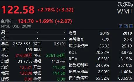 不过,在这种形势下,零售巨头沃尔玛(NYSE:WMT)的股价却逆市创下新高,表现出了罕见的强势迹象,盘中一度上涨至128.08美元。截至收盘,沃尔玛股价报122.58美元,涨2.78%,盘后交易中,涨1.69%,盘后价为124.7美元。最新市值达到3478亿美元,折合人民币市值达2.4万亿元。