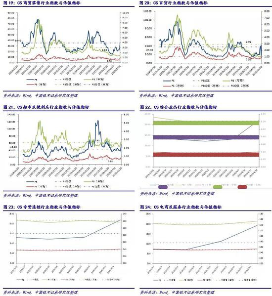 商贸零售行业总体以及CS百货、CS综合业态、CS专营连锁以及CS专业市场经营行业表现与其PB和PS变化趋势较为契合,但除超市及连锁便利的PS和PE高于历史均值外,其余行业PB、PS和PE的近期数值均低于历史均值水平,属于被市场显著低估的阶段。CS超市及便利店表现与PS、PE呈现出一定的契合,其 PE和PB低于历史较高水平,属于被市场略微高估的阶段。