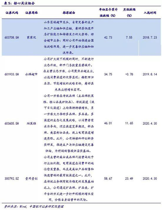 综合来看,此次疫情对于社消增速的阶段性冲击已在数据端充分显现,随着国内疫情的发展总体向好趋势,长期来看整体增速会经钟摆轨迹回归至疫情前期的均值水平,因此对于社消增速的波动不宜过分担忧,消费市场规模仍会持续扩张。随着2019年年报和2020年一季报的完全发布,市场情绪中对于公司业绩真空期以及疫情期间的不确定性降低,前期市场好看的超市行业、化妆品行业、电商及服务行业以及行业内的重点公司等均呈现出符合市场预期的表现。在此背景下,我们继续维持前期(Omni-channel)全渠道配置的逻辑不变,同时建议增持超市、化妆品以及电商服务中的优质标的:①在经济环境与社会环境出现短期内波动较大的背景下,超市作为消费者购买必需品的主要渠道之一,将凭借其作为实体店“体验”和“服务”的基础定位,通过专业型布局、数字化改造和互联网营销管理扩大自身优势,加速实现线上线下渠道联动;②当前国内的化妆品公司主营以护肤品居多,彩妆占比相对较低,而个护品类与护肤品品类必需属性相对较强,消费者的购买频次偏高且需求稳定,同时护肤品的毛利率水平亦相对较高,在当前的外部环境之下,化妆品公司可以极为有效的借助互联网渠道营销并落地销售,未来线上渠道也是触达更多消费者、拉动销售规模增长的核心动力之一;③疫情期间线上渠道相较线下的优势显现,电商渠道一方面不受经营场地和经营时间的限制,可以有效帮助更多的消费者接触更为广阔的消费选择,并提供更为精准匹配需求、物美价廉的商品服务筛选与推荐,同时伴随直播带货等新兴营销手段的发展,线上渠道的体验感逐步增强;可以为品牌商提供相关服务以拉升其营收业绩的服务商获得广阔的前景。公司方面,我们继续维持前期的推荐组合:家家悦(603708.SH)和永辉超市(601933.SH),并增加珀莱雅(603605.SH)和壹网壹创(300792.SZ)。