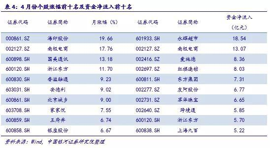 永辉超市(601933.SH)、南极电商(002127.SZ)、红旗连锁(002697.SZ)、东方集团(600811.SH)、友阿股份(002277.SZ)、萃华珠宝(002731.SZ)、跨境通(002640.SZ)、浙江东方(600120.SH)、上海九百(600838.SH)、鄂武商A(000501.SZ)等资金持续较高净流入(至少两个月);海印股份(000861.SZ)、南极电商(002127.SZ)、国美通讯(600898.SH)、浙江东方(600120.SH)、香溢融通(600830.SH)、安德利(603031.SH)、北京城乡(600861.SH)、家家悦(603708.SH)、王府井(600859.SH)、银座股份(600858.SH)持续出现涨幅。