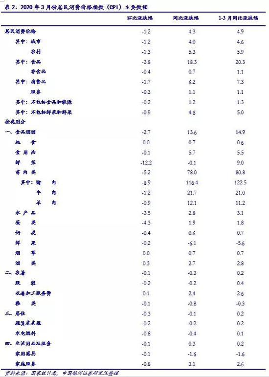 3月CPI同比增速较上月的4.3%滑落0.9个百分点至4.3%,维持在相对高位水平;CPI单月同比增速自2019年初开始一路走高,2020年1月达到过去8年(自2012年1月以来)的峰值;其中3月单月食品烟酒类价格同比上涨13.6%,影响CPI上涨约4.10个百分点;食品中,畜肉类价格上涨78.0%,影响CPI上涨约3.44个百分点,其中猪肉价格上涨116.4%,涨幅回落18.8个百分点,影响CPI上涨约2.79个百分点,生猪调运逐步畅通、屠宰企业复工复产、各地陆续加大储备肉投放力度等措施部分缓解价格压力;春季时令果蔬上市,交运恢复通畅,鲜果(降幅扩大)和鲜菜(由涨转跌)价格分别下降6.1%和0.1%,合计影响CPI下降约0.12个百分点。