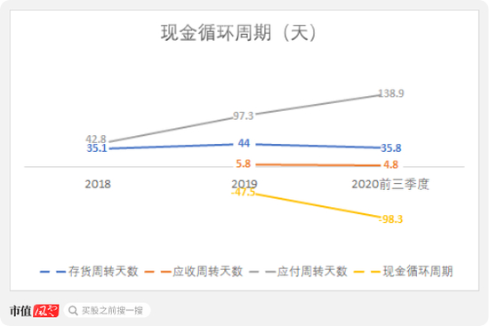 随着销量大涨,公司对上游的议价能力提高,应付账款周转天数从2018年42.8天,增加到2020年前三季度的138.9天。