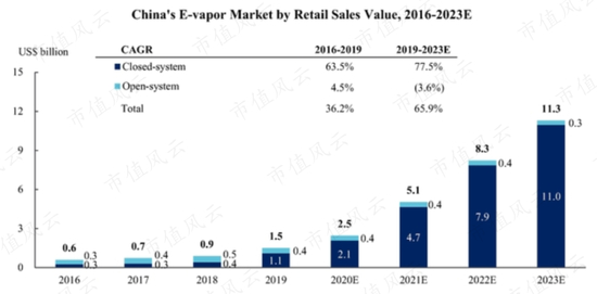 据预测,电子烟将会以65.9%复合年增长率增长,同时封闭式电子烟将会于2023年占据97%的市场份额。