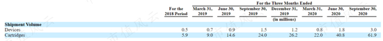 烟弹的出货量因疫情原因由2019Q4下滑420万颗至2020Q1 的2200万颗,但2020Q2、Q3恢复增长至4080万、6190万颗,创出新高。