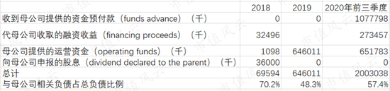 非经营性负债部分主要是与母公司相关。2018、2019、2020年前三季度涉及母公司的非经营性负债分别为0.7亿、6.46亿、20.03亿,占总负债的70.2%、48.3%、57.4%。