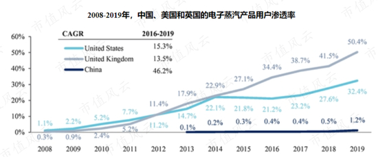 同时,电子烟的渗透率非常低,2019年仅为1.2%,而同期美国、英国的渗透率为32.4%、50.4%。(注:渗透率指电子烟用户数量除以传统可燃烧烟草用户数量)