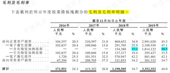 思摩尔国际含有陶瓷加热技术的电子雾化设备毛利率2019年为50.5%(注意这是供给企业客户的毛利率),高于雾芯科技同期37.5%的毛利率。