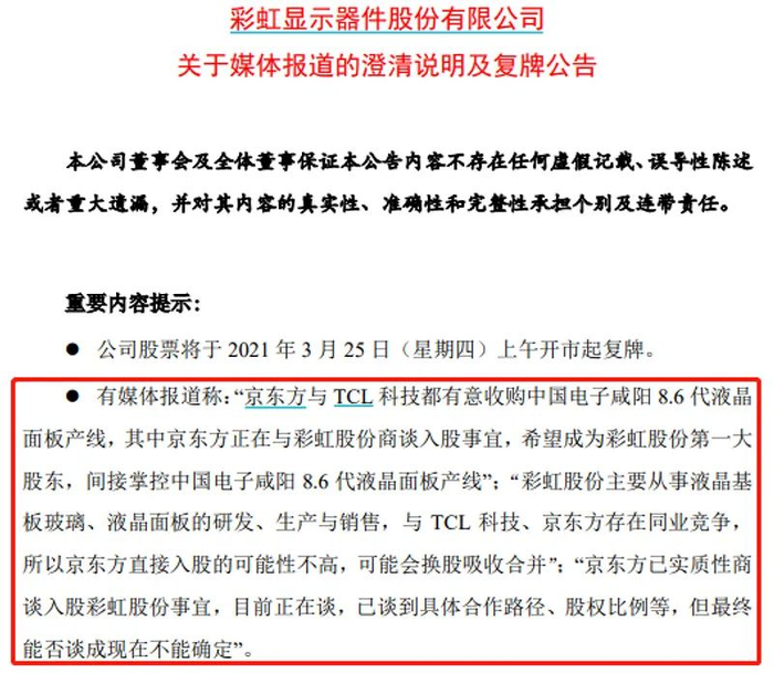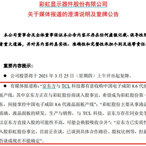 针对媒体报道,彩虹股份3月24日晚间发布了澄清说明及复牌公告。彩虹股份公告称公司、控股股东及实控人均不存在媒体报道所述的涉及公司控制权转让、股权转让及资产出售等事宜,也未与京东方等相关方进行过商谈。