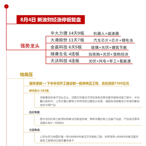 8月4日消息,指数早间高开低走,创业板指领跌。午后大盘探底回升,临近尾盘涨幅扩大,全天呈现V型走势。板块方面,受利好消息刺激,特高压、电力板块强势拉升,个股掀起涨停潮,半导体芯片股持续走强,农业服务、动物疫苗、CRO概念、东数西算概念、教育等板块表现活跃,白酒、券商板块盘中异动;近期强势的军工、汽车等赛道股陷入回调。总体来看,个股呈普涨态势,两市超3700股飘红,成交有所缩量,今日成交额再度不足万亿元。