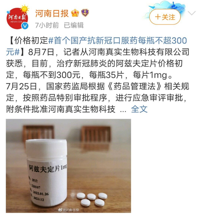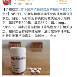 而真实生物的阿兹夫定片,从河南省政府网站了解到,目前,治疗新冠肺炎的阿兹夫定片价格初定,每瓶不到300元,每瓶35片,每片1mg,折合每片价格不到8.57元。此前真实生物专家曾在电话会上透露,阿兹夫定治疗新冠的用量是每天5mg,7天一个疗程,以此次披露的价格计算,治疗新冠单疗程对应价格为300元左右。