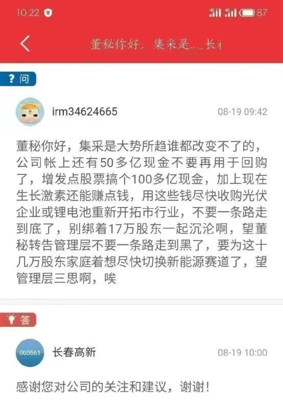 此前8月19日,有网友在投资者平台喊话长春高新董秘引热议:“集采是大势所趋谁都改变不了的,公司帐上还有50多亿现金不要再用于回购了,增发点股票搞个100多亿现金,加上现在生长激素还能赚点钱,用这些钱尽快收购光伏企业或锂电池重新开拓市行业,不要一条路走到底了。”