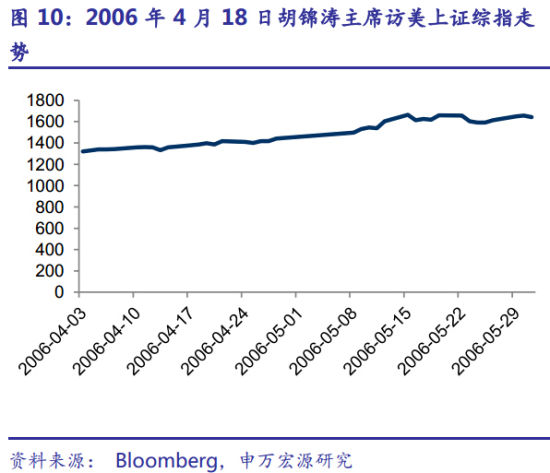 历次中国主席访美两个月内的上证综指来看,按时间先后有三种特征:访美当日或次日指数飙升比较明显,随后会回到访问前的状态,如 1997 年,2002 年两个年份表现尤其明显;第二种特征:访美后上证综指开始上升,如胡锦涛主席的两次访美和习近平作为副主席的一次访美;第三种情况是访问后上证综指开始走低,如 2013年 6 月习近平主席和奥巴马总统的庄园会晤。申万宏源认为中国股市不仅与领导人出访有关,还跟中国资本市场的发展程度有关。