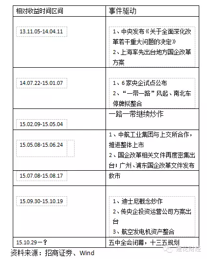但从阶段性来,国企改革概念股在事件、政策等刺激下均有较好表现。不过,相关标的不是全线上涨,而是子行业或相关的地区标的上涨。比如,2013年11月到2014年4月阶段,上海率先出台改革方案催生了上海本地国企改革标的股大涨;2015年5月到2015年6月阶段,中航工业集团与上交所合作、地方国企改革文件密集出台,军工、央企、地方国企等标的股大涨。(如图)