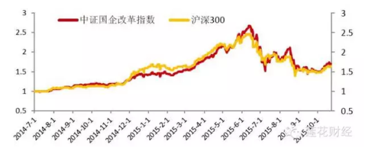 国企改革在近年来一直是市场关注的焦点,也是2013年11月至今“跨年度”的主题投资机会。不过,从国企改革指数与沪深300指数看,国企改革指数在近一年来没有跑赢指数(如图),指数表现的弹性不足。因为国企改革涉及的上市公司较多,央企和地方国企共计多达971家公司,市值占总市值一半以上。