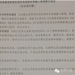 据了解,由地方证监局召集个别几家大型券商开会,征求第三方平台准入意见,并下发了《证券期货经营机构信息系统外部接入管理暂行规定(征求意见稿)》,一共有25条规定。