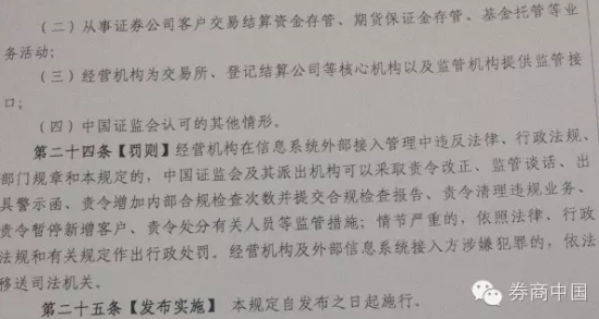 从券商中国记者获得的暂行规定(征求意见稿)全文(共25条)来看,证监会明确禁止向除经营机构,以及外部信息系统接入方之外的第三方开放与外部信息系统从事业务有关的接入权限。