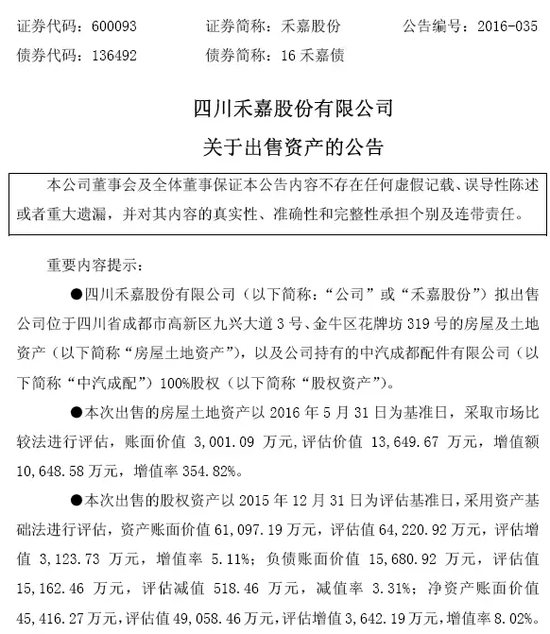 9月29日,禾嘉股份公告称,拟出售公司位于四川省成都市高新区的房屋及土地资产,以及公司持有的中汽成都配件有限公司(简称“中汽成配”)100%股权。公告显示,房屋土地资产评估增值率高达354.82%。