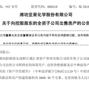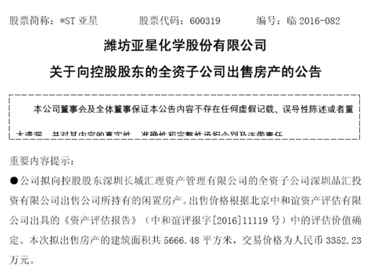 9月30日,*ST亚星公告,拟向控股股东长城汇理全资子公司品汇投资出售上海、广州等地6处闲置房产。本次拟出售房产的建筑面积共5666.48平方米,交易价格为3352.23万元,增值率367.67%。