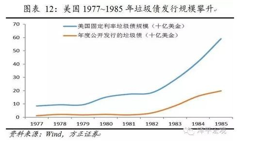 而垃圾债也在当年得到了空前的发展,80年代最初的五年时间里,年度公开发行的垃圾债规模以及固定利率垃圾债存量规模分别从17亿美元和94亿美元飙升至198亿美元和591亿美元,增幅分别高达11.6倍和6.3倍!