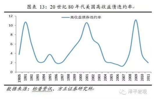 高收益债在70-80年代的盛行也催生了资产泡沫。80年代末,关于高收益债的负面新闻开始鹊起,高收益债市场受到情绪、监管、信贷紧缩等一系列因素影响,其市场承受了巨大的抛压,债券违约率迅速攀升。整个80年代,高收益债的平均违约率仅仅不到4%,到了1991年,高收益债的违约率蹿升至11%左右的空前高位。
