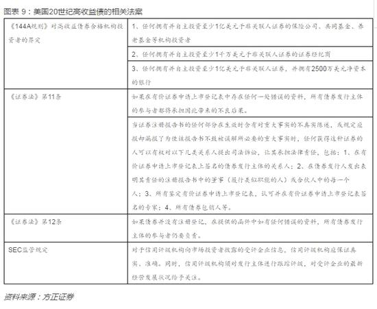 在当时美国对高收益债发行者的限制大致有两点:其一是高收益债的发行对象是被严格限制的,按照当时的法律,其只能对“不需要受强制信息披露制度保护并且‘自己可以照顾自己’的对象发行”。其二是发行人需要遵循证券法所规定的其他义务,尤其是“反欺诈法”(具体细节可见下表)。从这系列制度来看,并未有融资收购的禁行字眼,这在一定程度上也为米尔肯的高收益债融资收购形成了比较自由的制度基础。