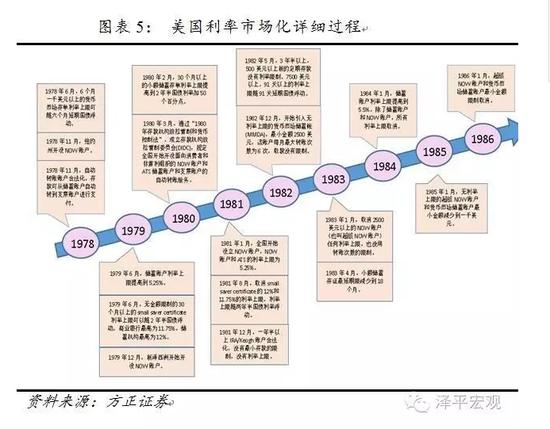 1978年,美联储规定银行发行6个月定期存款(CD),而其利率则受制于每周国债拍卖市场价格。虽然当时的CD产品存在最低限额的门槛,但存款机构的资金仍大量流入到这些监管较松的CD产品之中。其后,也在资金脱媒化的倒逼之下,美国陆续实施了“1980年存款机构放松管制以及货币控制法”、“1982年存款机构法”、“Q条例”等促成利率市场化的政策,逐步放松自动转账服务(ATS)账户、小额储蓄存单、NOW账户、货币市场储蓄账户的利率管制,直到1986年3月,客户存款利率管制被完全取消。